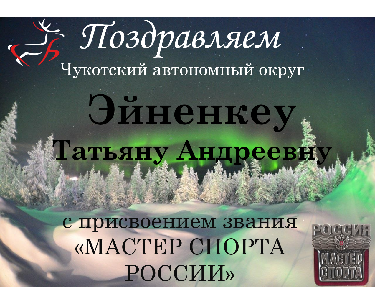 Поздравляем Чукотский автономный округ , Эйненкеу Татьяну Андреевну с заслуженным присвоением почетного звания "Мастер спорта России"